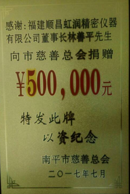 2017年7月28日,南平市慈善捐贈大會暨市慈善總會換屆會議在南平市委舉行,福建順昌虹潤董事長林善平再次當選為南平市慈善總會第三屆理事會副會長,這也是林善平董事長第三次當選此職。同時,在本次慈善捐贈大會上,他再次向市慈善總會捐款50萬元。他表示,他還將一如既往,繼續加大對社會公益事業的支持力度,積極投身公益和慈善事業,為南平市的慈善事業作出更大的貢獻。目前,林善平董事長各項公益捐款累計已達1000余萬元。