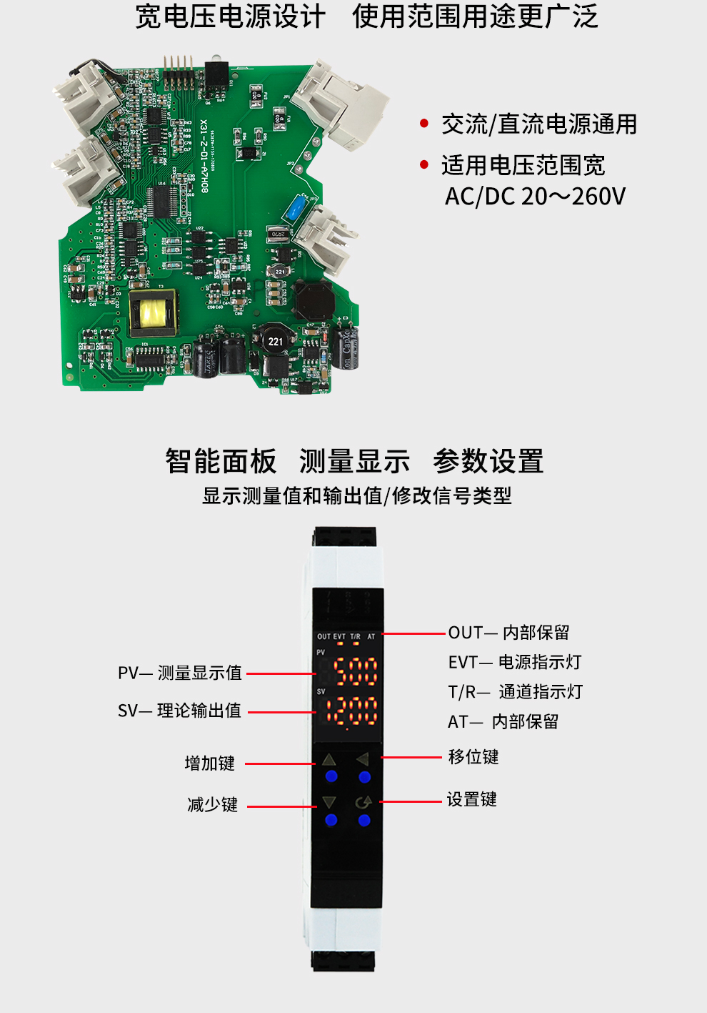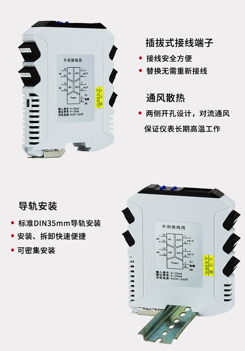 OHR-X31系列導軌式智能隔離器將現場的直流電壓或電流信號經過隔離傳送,轉換成所需的信號給其它儀表??梢耘cDCS、PLC等系統配套使用,從而提高工業生產過程自動控制系統的抗干擾能力,保證系統的穩定性和可靠性。寬電源設計:20-260V交直流供電。配置高清顯示單元,通過輕觸按鍵設置每個通道的參數及通道之間的切換。高抗干擾、穩定性好、可帶RS485通訊