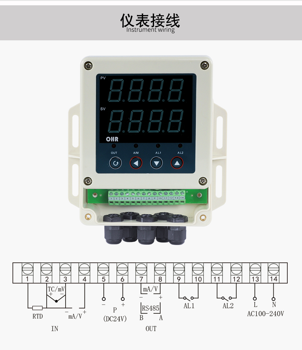 OHR-BG10系列壁掛式數字顯示控制儀采用了表面貼裝工藝,全自動貼片機生產,具有很強的抗干擾能力。可對溫度、壓力、液位等工業過程參數進行測量、顯示、報警控制、變送輸出、數據采集及通訊。