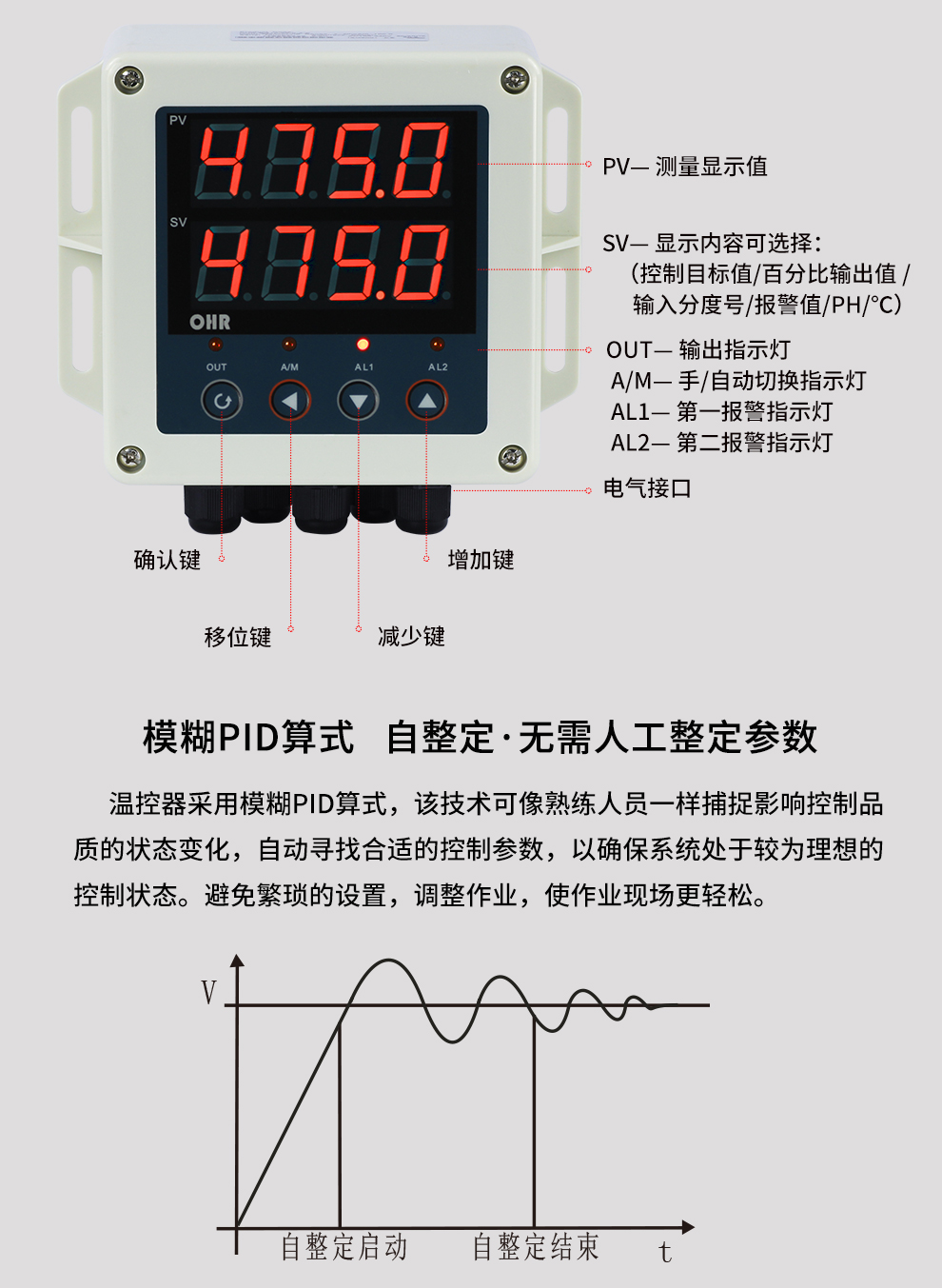 OHR-BG30/BG40系列壁掛式智能溫控器/60段程序溫控器采用了表面貼裝工藝,全自動貼片機生產,具有很強的抗干擾能力。本儀表采用人工智能算式,儀表啟動自整定功能,可以根據被控對象的特性,自動尋找參數以達到很好的控制效果,無需人工整定參數,控溫精度基本達±0.2℃,無超調、欠調,性價比高。