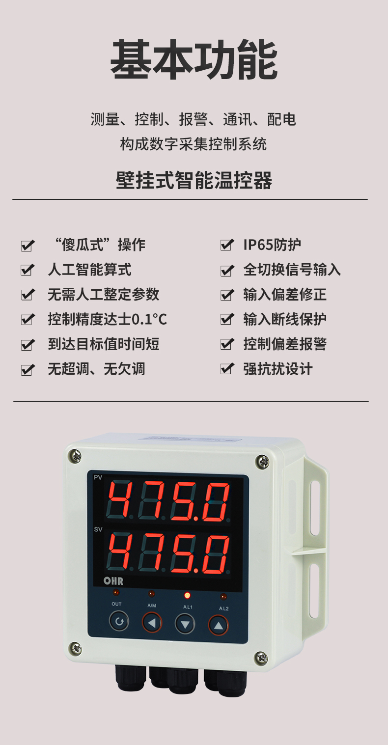 OHR-DN30/DN40系列導(dǎo)軌式智能溫控器/60段程序溫控器采用了表面貼裝工藝,全自動貼片機生產(chǎn),具有很強的抗干擾能力。本儀表采用人工智能算式,儀表啟動自整定功能,可以根據(jù)被控對象的特性,自動尋找參數(shù)以達到很好的控制效果,無需人工整定參數(shù),控溫精度基本達±0.2℃,無超調(diào)、欠調(diào),性價比高。