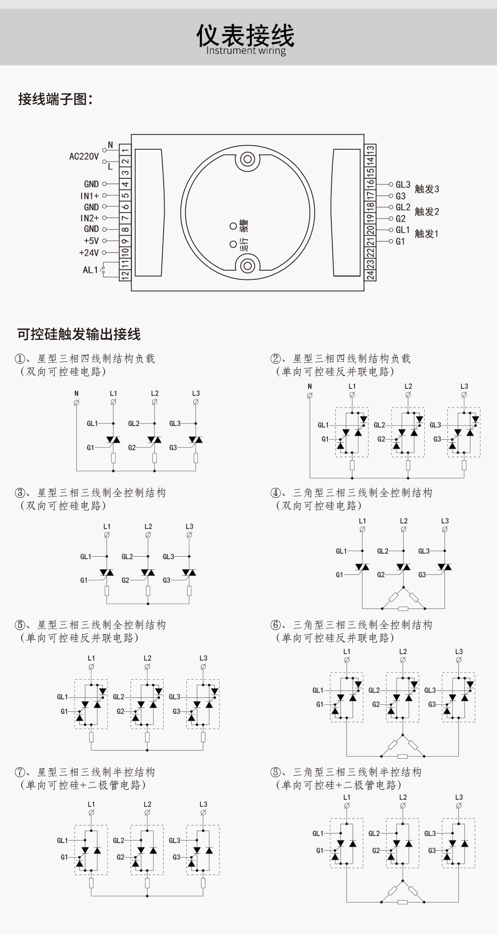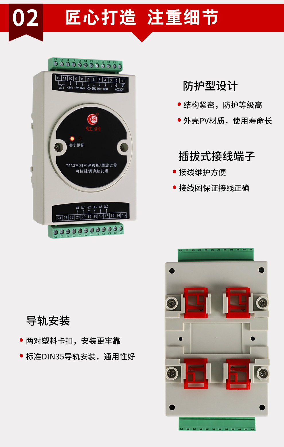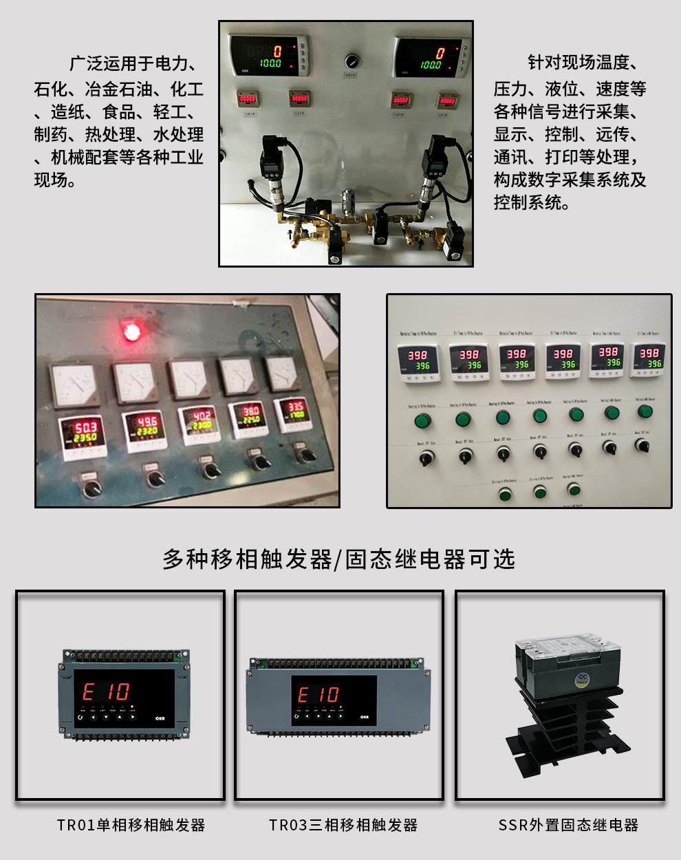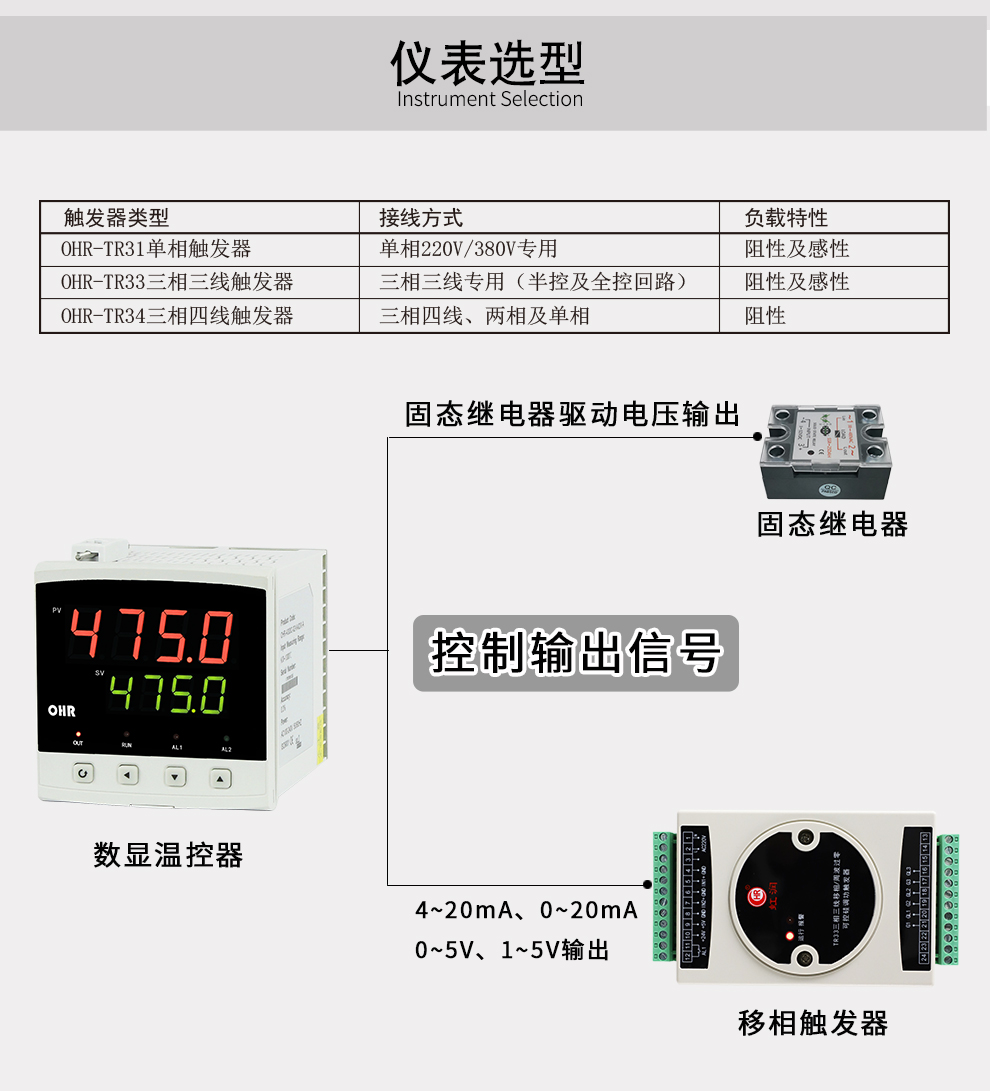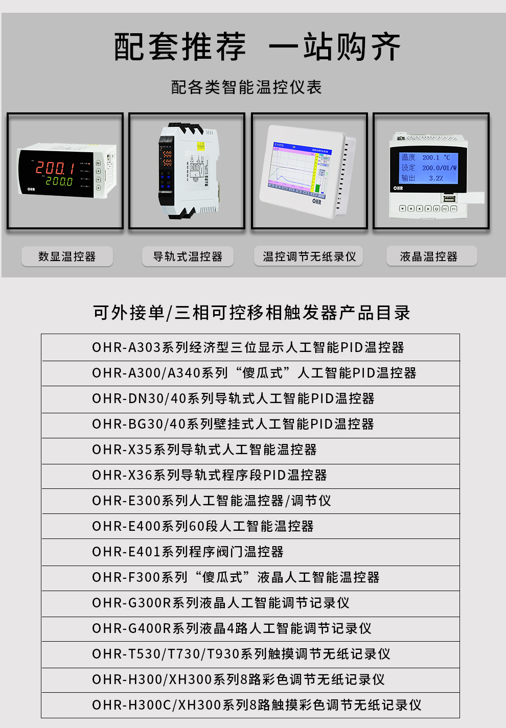 OHR-TR30系列移相觸發器是應用了單片機技術的智能化單/三相移相觸發器,功能強大且可靠性高,能適應各種 電阻絲、硅碳棒及負載采用變壓器降壓的硅鉬棒、鎢絲等各種類型工業電爐,也可用于電機軟啟動的控制。