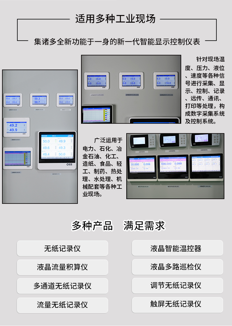 虹潤公司是專業生產無紙記錄儀的國家專精特新“小巨人”企業。生產的觸摸屏調節無紙記錄儀,具有觸摸大屏顯示,真正人工智能算式,無需人工整定參數,控制精度達士0.1°C,數據記錄與轉存, RS485/以太網通訊,5/7/9英寸可選等特點。產品獲得智能化控制器、人工智能調節器及調節方法、模糊PID控制儀及控制方法、平板無紙記錄儀、巡回檢測顯示方法及裝置等5項國家發明專利,主持起草物聯網智能記錄儀表通用技術條件、物聯網智能溫度儀表通用技術條件、工業過程測量和控制系統用智能調節器等3項國家標準,通信系統多通道數據采集控制終端規范軍用標準,以及空間數據與信息數據傳輸系統等2項航天標準,參與國際5G標準制定,取得觸摸屏彩色調節無紙記錄儀等3項相關軟件著作權。產品廣泛應用于電力、石化、冶金、化工、食品、制藥、熱處理、水處理、機械配套等諸多領域。