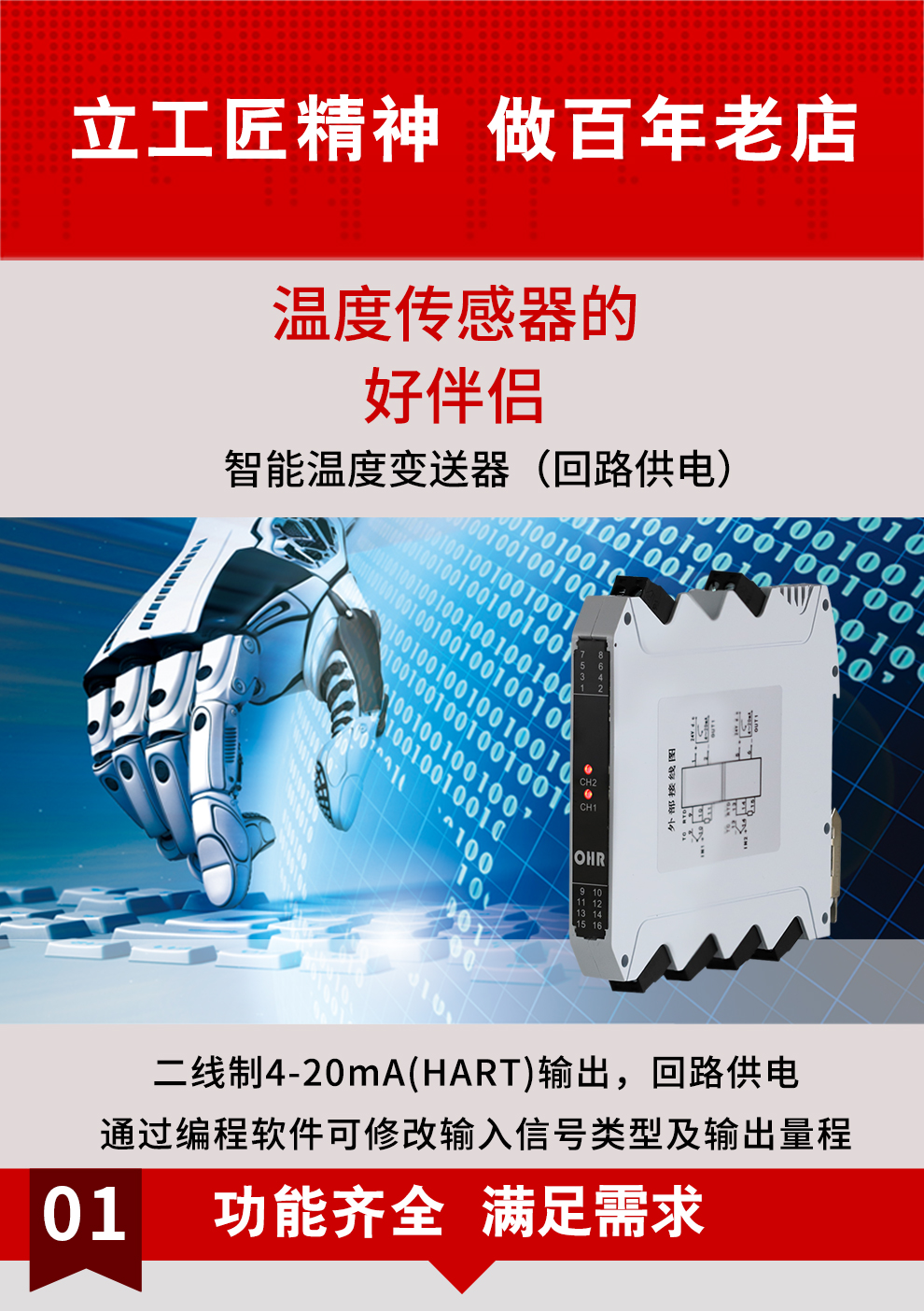 回路供電溫度變送器分為M213智能溫度變送器、M214隔離智能溫度變送器、M215 HART智能溫度變送器,變送器將現場的熱電阻或熱電偶信號經過隔離放大處理,轉換為與溫度成線性的二線制4-20mA(HART)信號輸出至控制系統。