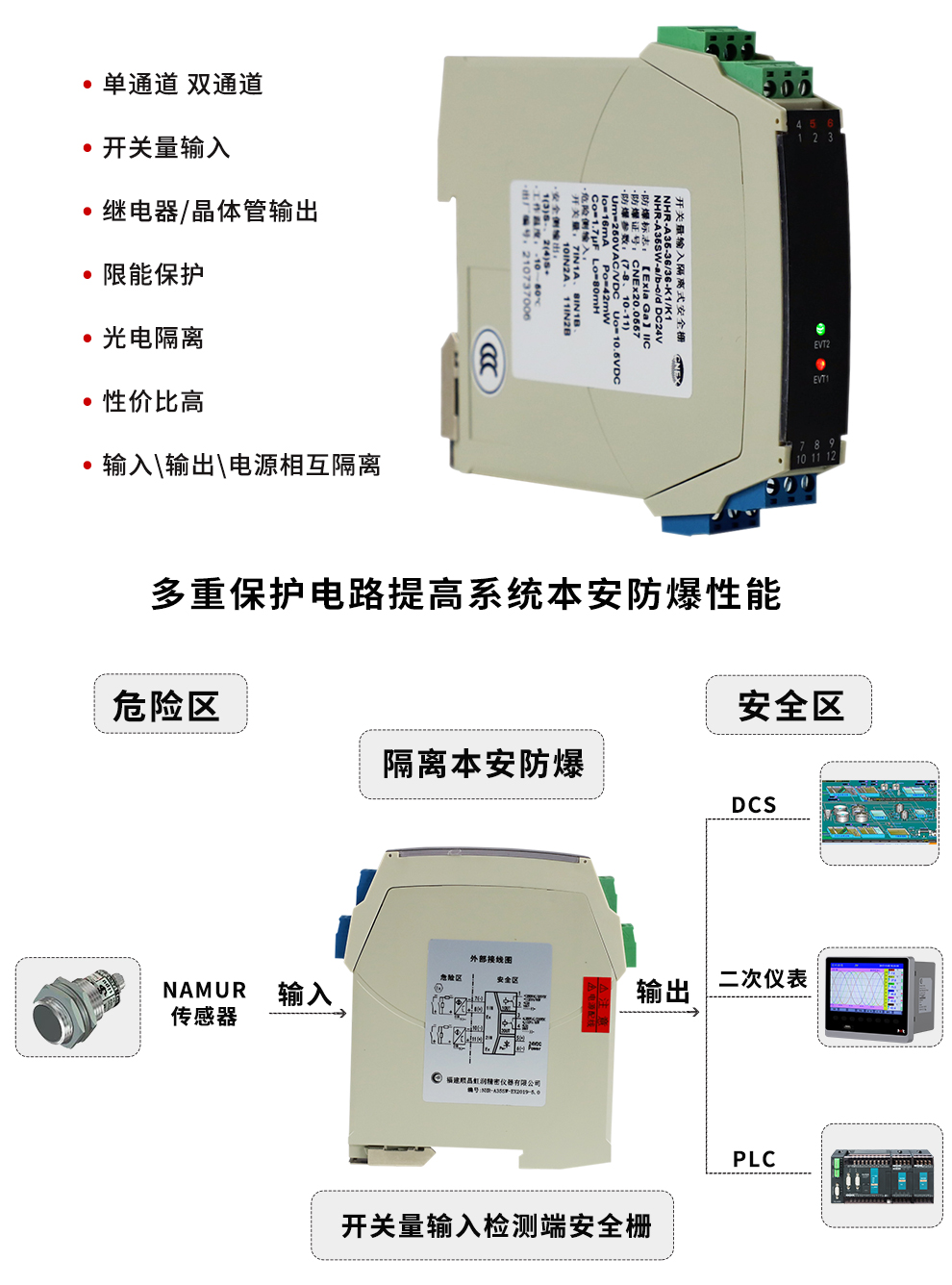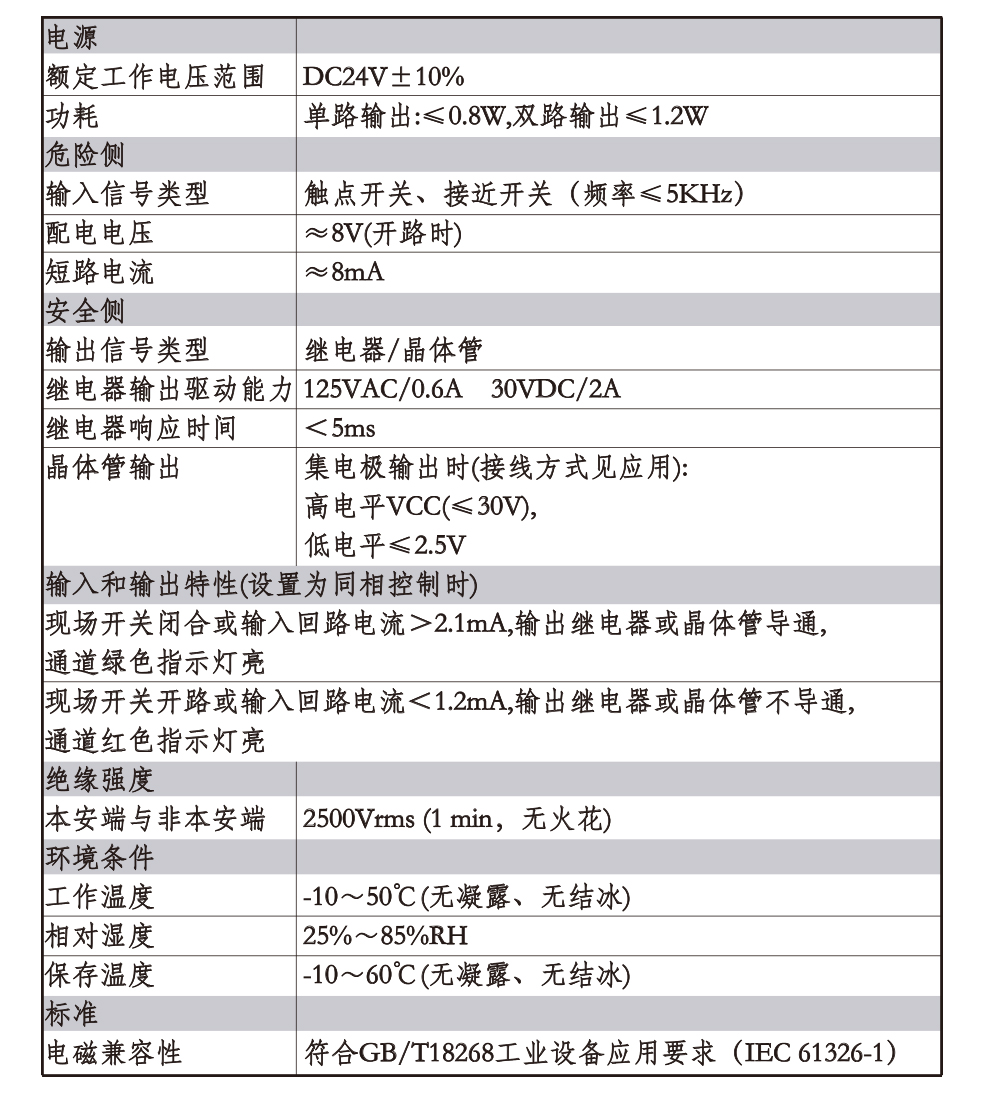 OHR-A35系列開關量輸入檢測端隔離柵接受來自危險區的開關或接近開關輸入,通過安全柵隔離輸出到安全側的繼電器或晶體管輸出,它具有輸入狀態檢測指示,可進行正反向控制,該產品需獨立供電,輸入/輸出/電源三隔離。