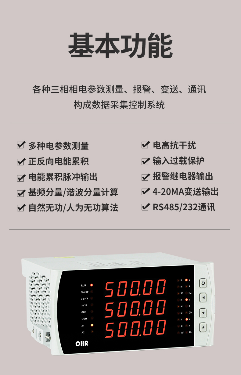 OHR-C300系列三相綜合電量表采用大規(guī)模集成電路和高亮度長壽命的LED顯示器,應(yīng)用數(shù)字采樣技術(shù),對三相電氣線路中的相電壓、線電壓、相電流、線電流、有功功率、無功功率、視在功率、頻率、功率因數(shù)、等進(jìn)行實(shí)時(shí)測量顯示與控制。
