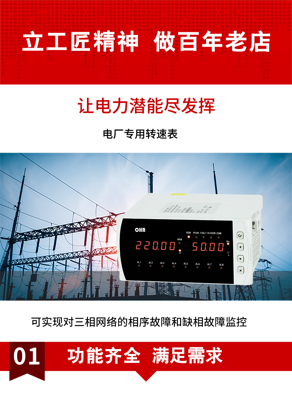 OHR-C800系列電廠專用轉速表適用于測量發電機組轉速,儀表雙屏顯示轉速、電壓、頻率、百分比轉速,有峰值記憶顯示、斷線報警、故障(蠕動)報警、8路繼電器跟隨百分比轉速輸出、模擬量變送輸出、RS232/485通訊接口等功能。