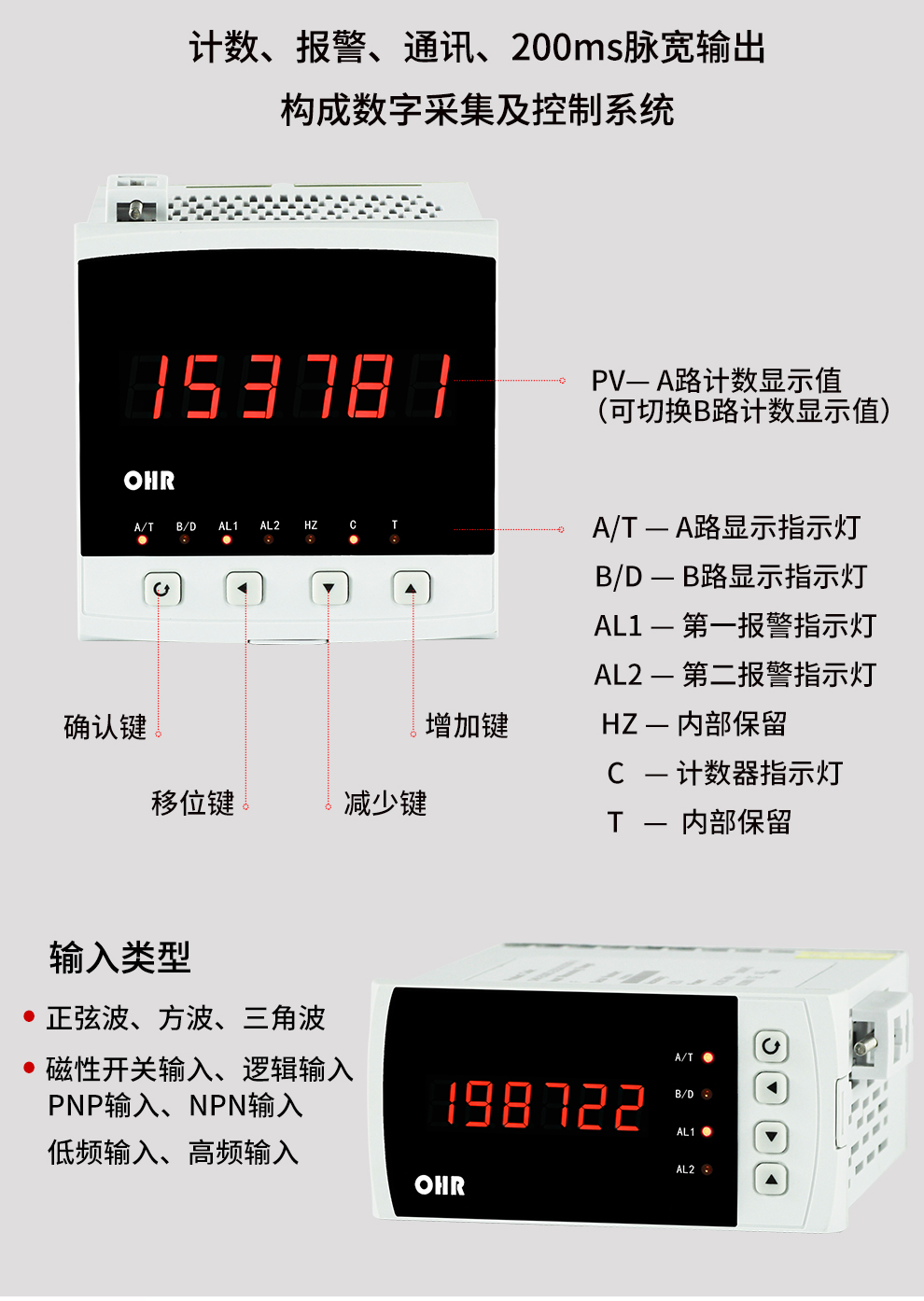 OHR-B300系列計數器采用全自動貼片封裝工藝,具有很強的抗干擾能力,并具有多種輸出功能和控制功能,多種計數模式,廣泛運用于電力、石化、冶金、輕工、制藥、航空等諸多領域。