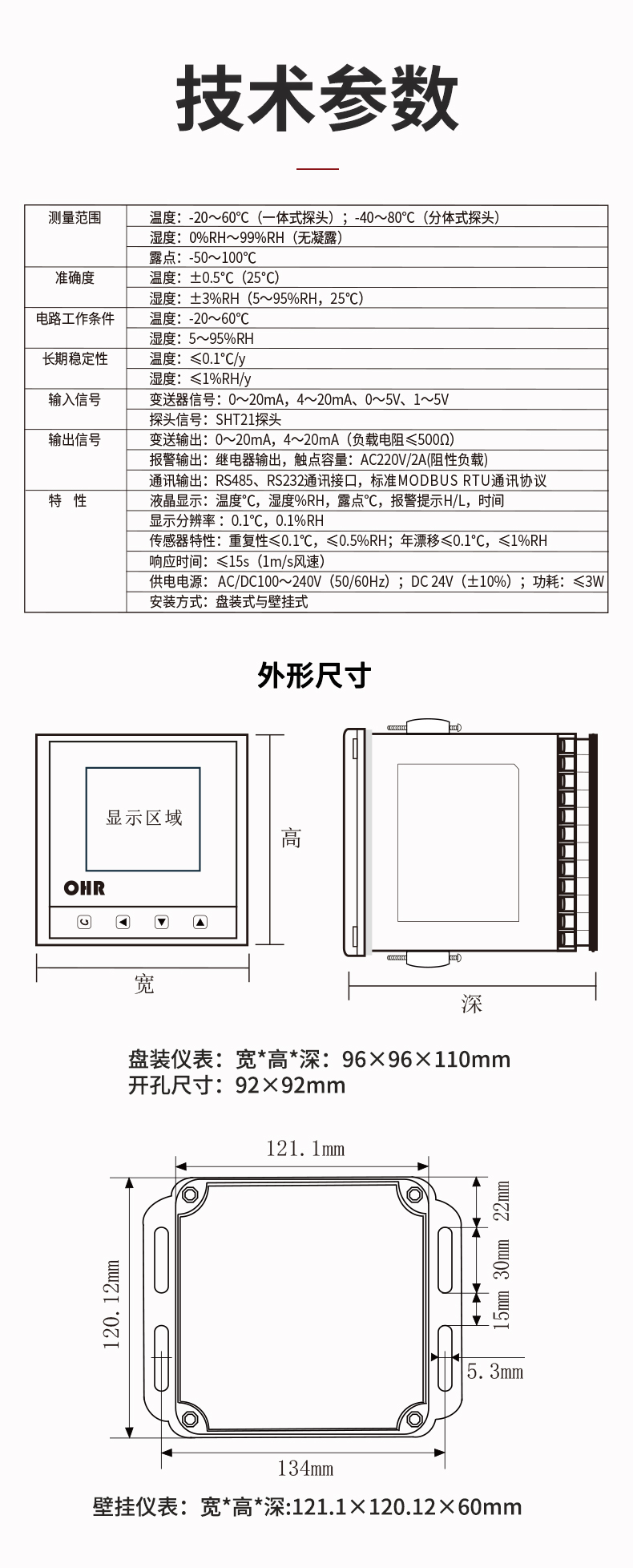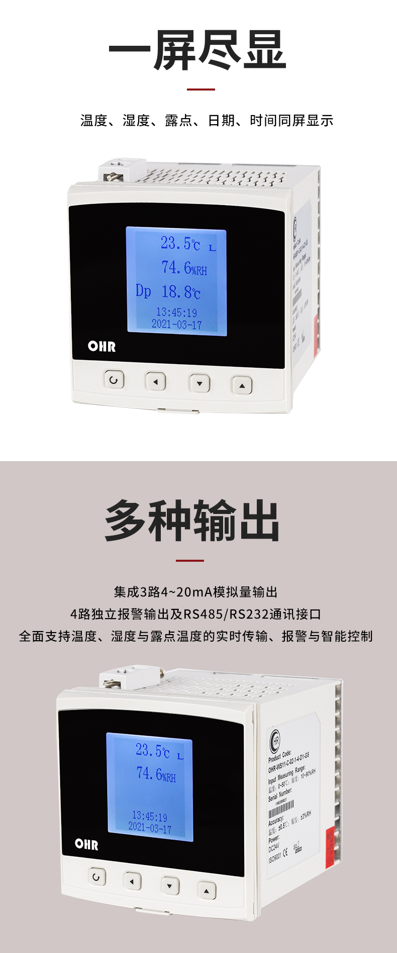OHR-WS10系列溫濕度控制儀以先進的32位ARM處理器為核心,采用進口高性能溫濕度傳感器,可同時對被測環境的溫度、濕度進行測量和控制,并可通過溫、濕度計算出露點。它具有精度高、穩定性強、響應速度快等特點,適用于通訊機房、辦公室、醫院、檔案館、博物館、賓館、樓宇自控等場所的溫濕度測量。