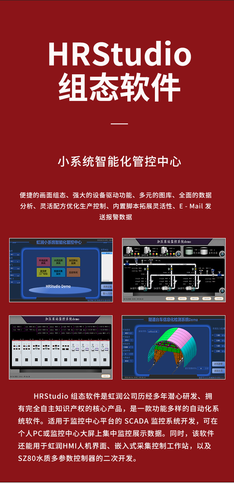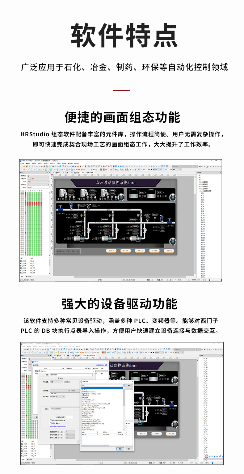 虹潤公司是專業(yè)研發(fā)組態(tài)軟件的國家專精特新“小巨人”企業(yè)。開發(fā)的HRStudio組態(tài)軟件,具有便捷組態(tài)畫面,強(qiáng)大設(shè)備驅(qū)動,多元化的圖庫,數(shù)據(jù)庫操作,內(nèi)置腳本拓展,權(quán)限管理數(shù)據(jù)備份等特點(diǎn)。產(chǎn)品獲得嵌入式數(shù)據(jù)采集工作站組網(wǎng)系統(tǒng)等1項(xiàng)國家發(fā)明專利,主持起草通信系統(tǒng)多通道數(shù)據(jù)采集控制終端規(guī)范軍用標(biāo)準(zhǔn),空間數(shù)據(jù)與信息數(shù)據(jù)傳輸系統(tǒng)等2項(xiàng)航天標(biāo)準(zhǔn),以及現(xiàn)場設(shè)備集成等5項(xiàng)智能制造國家標(biāo)準(zhǔn)。參與國際5G標(biāo)準(zhǔn)制定,取得HRStudio 畫面組態(tài) 等1項(xiàng)相關(guān)軟件著作權(quán)。產(chǎn)品廣泛應(yīng)用于冶金、石化、制藥、設(shè)備配套、環(huán)境監(jiān)測、農(nóng)業(yè)、生產(chǎn)過程控制等諸多領(lǐng)域。